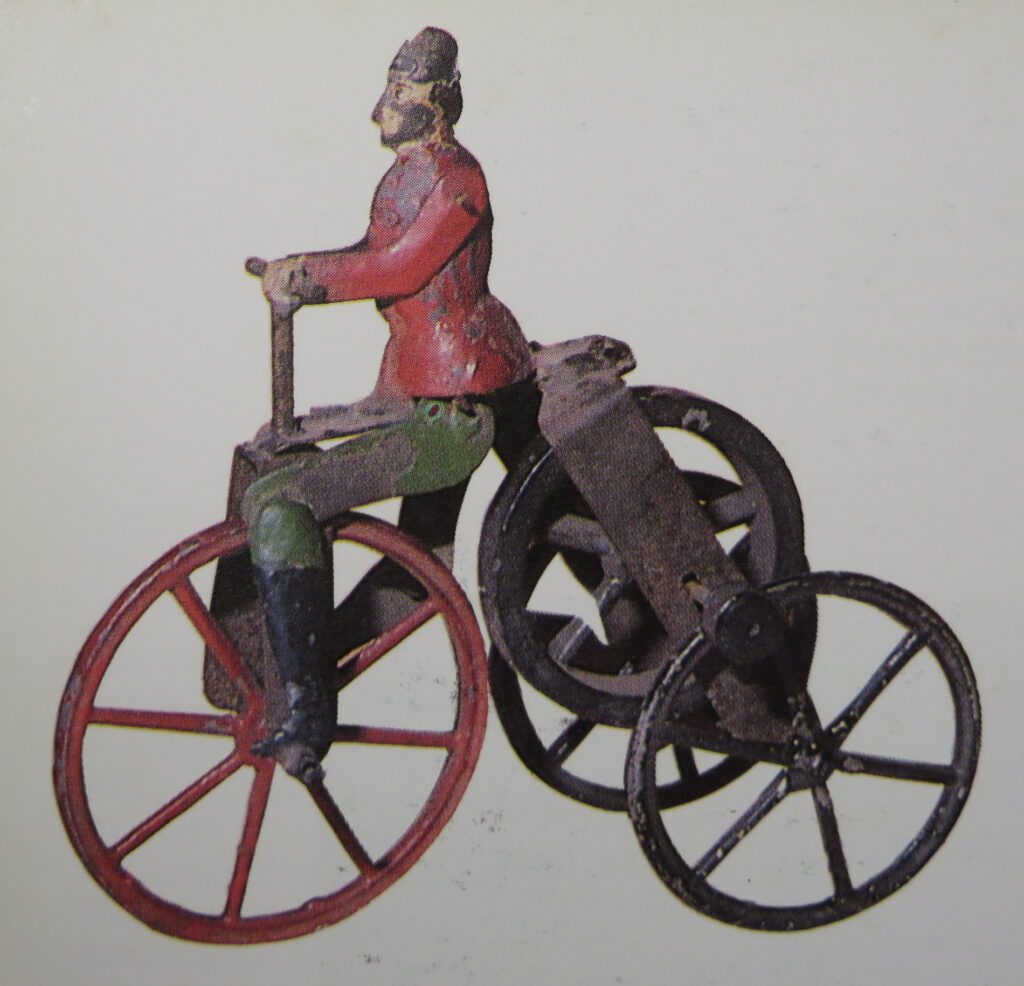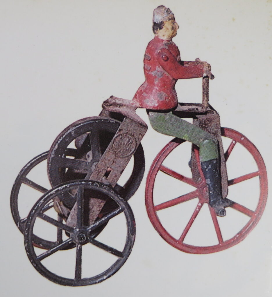 These two versions differ slightly, the version from the museum in Paris has a yellow blue body and the version from the book by Frédéric Marchand has a red body. The figure on this bicycle was used frequently by Martin at that time.