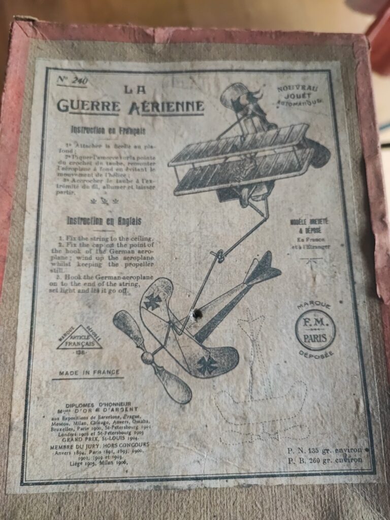 This toy depicts an aerial battle between a German plane called the Pigeon piloted by Von Richthofen (aka the Red Devil) and a French plane piloted by Adolphe Pégoud.