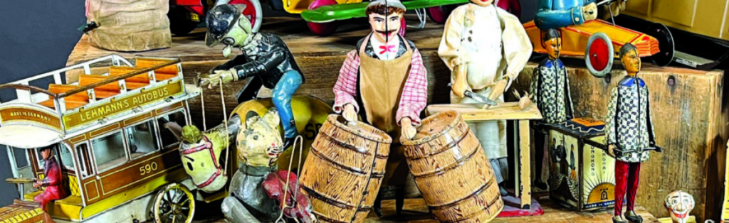A colorful one day sale with a focus on international tin toys | Space & Robots, European tin wind-ups, Lehmann’s & Martin, Automobiles & Motorcycles, Pre-War Japanese toys, Comic characters, WW2 soldiers & figures, and more!