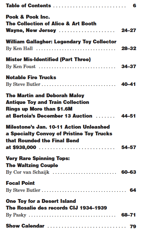 An overview of the contents of the new Antique Toy World Magazine April 2026