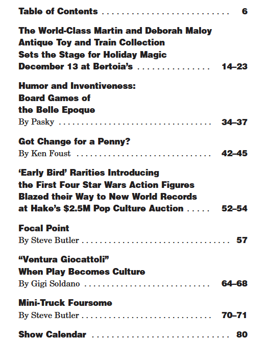 An overview of the contents of the new Antique Toy World Magazine December 2025