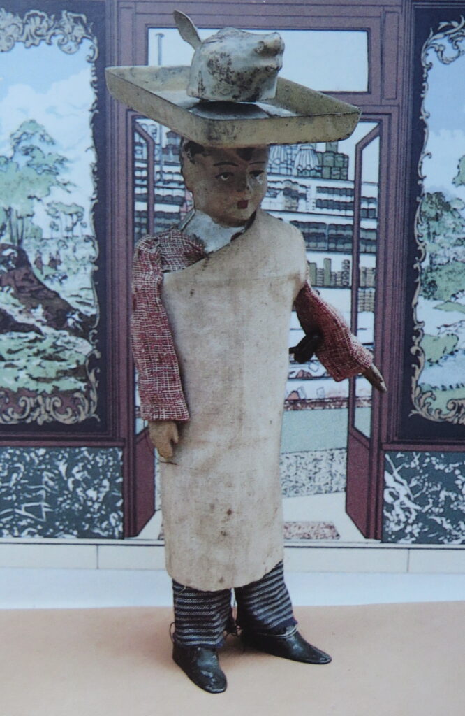 After winding the clockwork he starts walking and the pig’s head then turns around on the scale on his head.