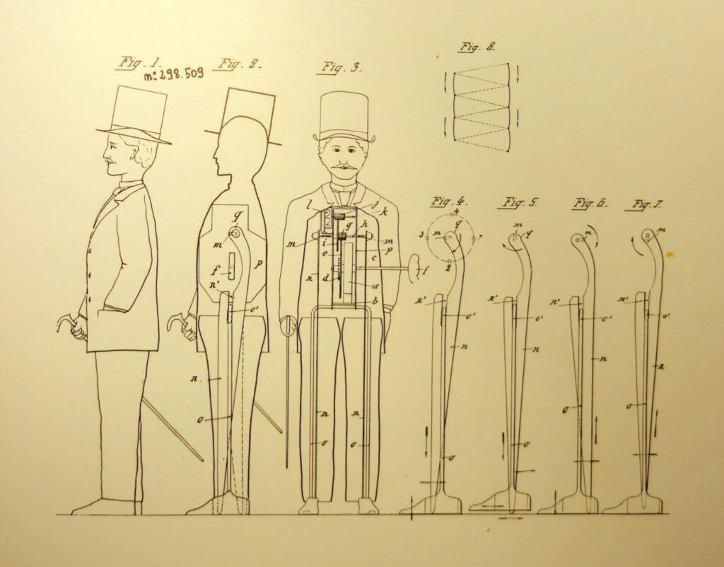 The legs lift up one by one and because there is a “pin” mechanism in the inside of his shoes, see below in the patent drawing : Fig. 4 – 5 – 6 and 7, he remains upright while walking and does not fall over.
