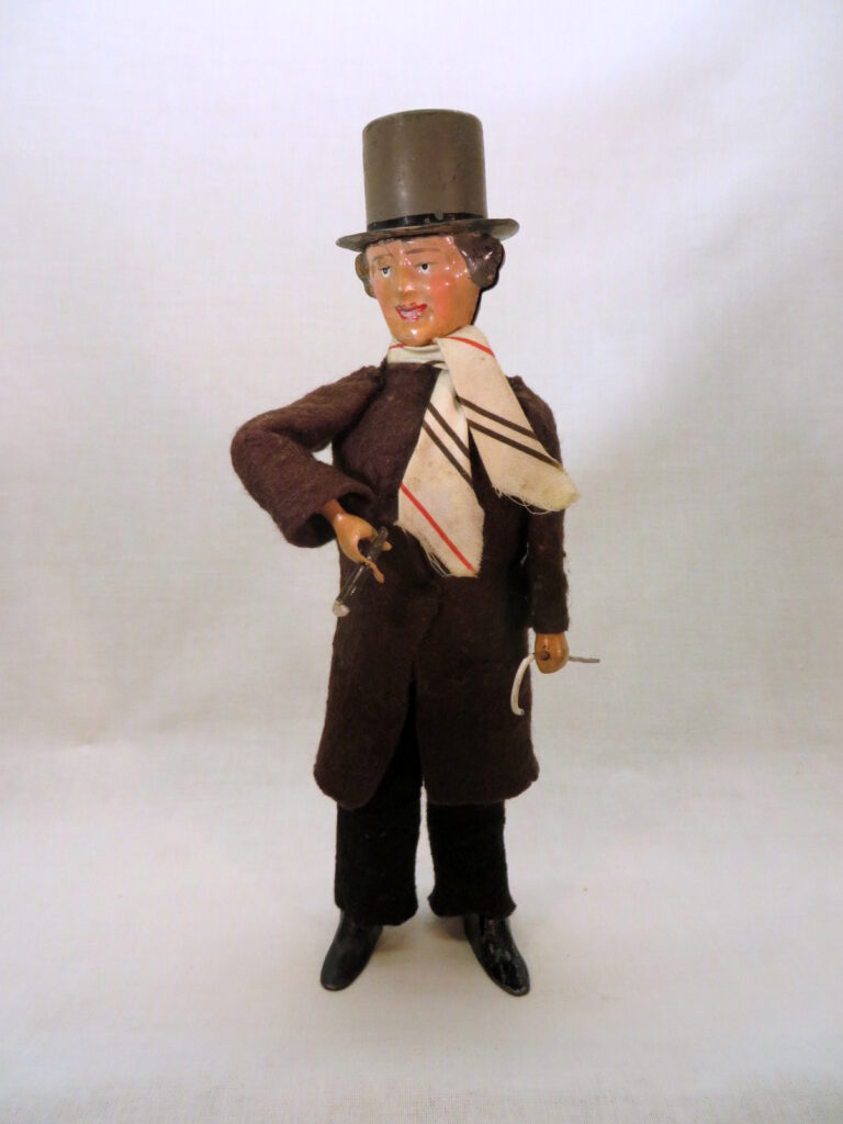 His official name is “Le Vieux Marcheur” but on a picture from the French magazine Soleil du dimanche from 1905, I found in an article specifically about the Martin toys, with another name: Le Gommeux. There are many translations for this in English but what I think they mean is: The Dandy