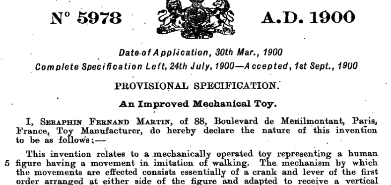 This dignified gentleman has a special walking mechanism which can be seen on the patent drawing, this mechanism was used the first time on the Les Agents number 178.